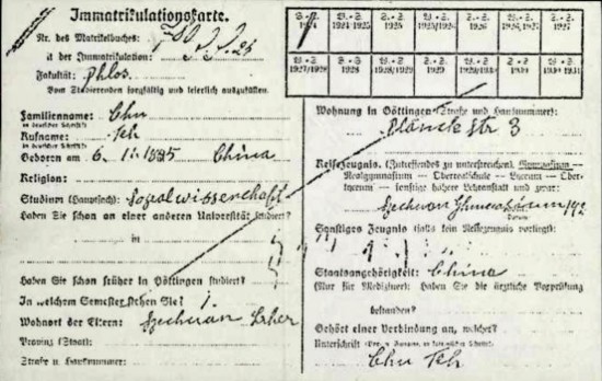朱德在德国哥廷根大学填写的“大学录取登记卡”